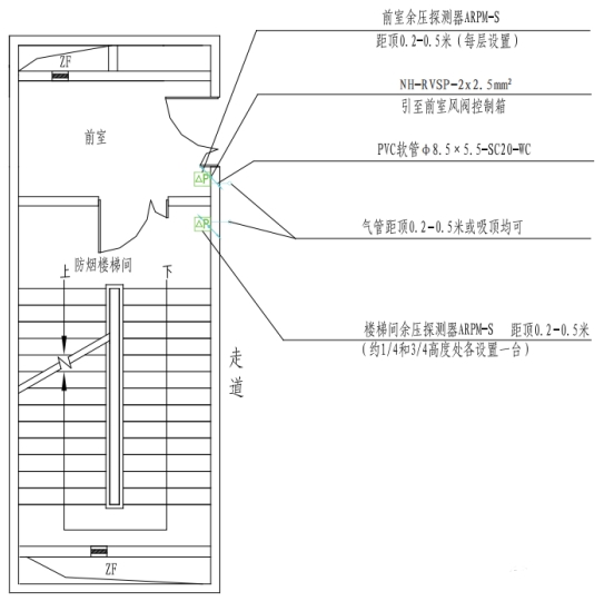 4)余壓深測器通過N-IYSP-2x2.5m2-SC20-C,沿樓板垂直敷設至風間操控箱。
