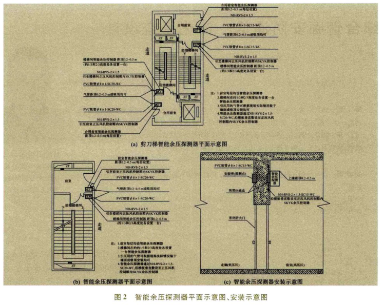 2.余壓探測(cè)器的設(shè)置:應(yīng)在每層防煙樓梯間的前室或者合用前室設(shè)置1臺(tái)余壓探測(cè)器;在樓梯間高度約1/3和2/3處各設(shè)置1臺(tái)余壓探測(cè)器或者在加壓送風(fēng)口處設(shè)1臺(tái)余壓探測(cè)器,余壓探測(cè)器應(yīng)設(shè)置在高壓區(qū)(樓梯間、前室區(qū)域疏散門(mén)側(cè)),距頂0.1~0.5 m壁掛安裝,采用底座直接固定在預(yù)埋86盒上。智能余壓探測(cè)器平面示意圖、安裝示意圖如圖2所示。