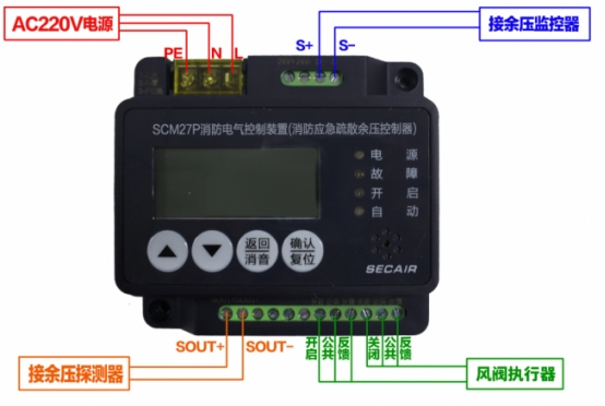 將銜接余壓探測器的無極性二總線接入27P的"SOUT+"、"SOUT-"端;