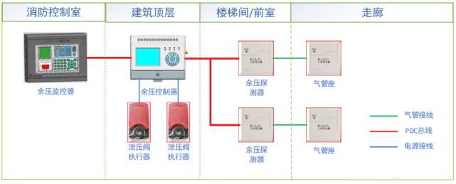 如上圖,余壓探測器安裝在樓梯間或者前室,通過氣管與安裝在走道氣管座相連,探測兩個空間氣壓差。
