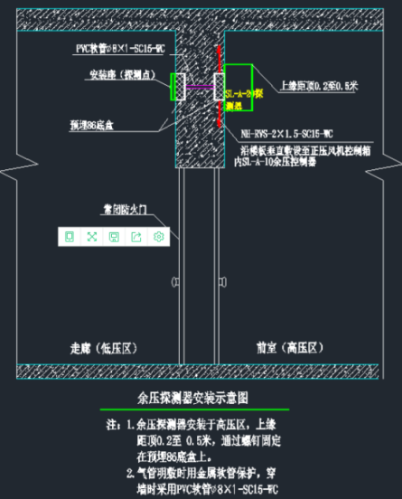 余壓探測器:也叫壓差控制器、余壓探測器、壓力傳感器等,如圖,壁掛安裝樓梯間、前室內防火門那一側(上圖右上部分),氣流穩定避開風口的地方,距頂20~50公分,直接固定在預埋86盒上壁掛安裝。