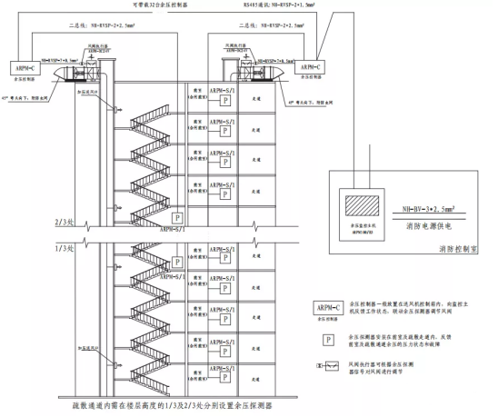 2)樓梯間在約1/4和3/4高度處各設(shè)置一臺(tái)余壓探測(cè)器;