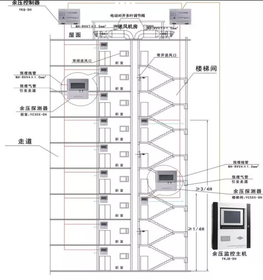 現在加壓送風體系本身,沒有才能來判斷加壓區是否堅持一定壓力,或加壓區泄露過大,壓力達不到規范,起不到防煙作用,或因壓力過大而形成分散門阻塞,而怎么能及時探測加壓區壓力狀況,以調整加壓送風量,使樓梯間和前室堅持相對安穩的余壓是一個關鍵問題。因而設置余壓監控體系,是確保加壓送風體系在火災中完美使用的必然選擇。 設計裝置余壓監控體系,可有用解決分散門兩邊壓差過大而導致門無法正常敞開的毛病,確保分散通道的安全暢通,使加壓送風設備處于合理、有用的作業狀況,為了在災情狀況下保證了人員的分散和解救。