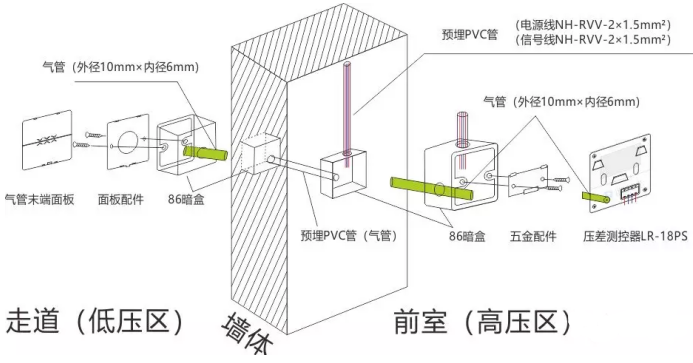 在前室、樓梯間壓力(壓差)傳感器安裝之前,建議按照下圖做預埋處理,安裝將更加方便,且更加美觀。
