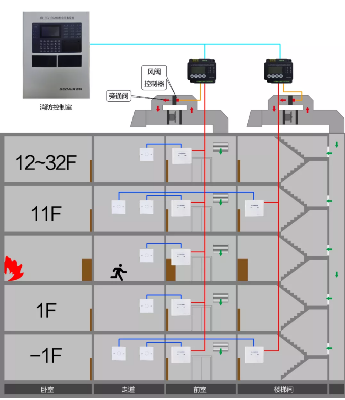 2、對(duì)于樓梯間,由于余壓監(jiān)控區(qū)域?yàn)橐粋€(gè)空間且上下貫通,余壓傳感器僅在整個(gè)建筑樓梯間高度的1/3處安裝一個(gè),余壓傳感器的探測(cè)點(diǎn)一側(cè)設(shè)于樓梯間,另一側(cè)設(shè)于走道,余壓設(shè)定值為40-50pa,當(dāng)系統(tǒng)控制區(qū)域超壓時(shí),系統(tǒng)聯(lián)動(dòng)控制泄壓閥執(zhí)行器,根據(jù)實(shí)際余壓值與設(shè)定值的差異調(diào)節(jié)泄壓閥,以保證前室正壓為設(shè)定值。
