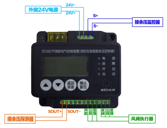將連接余壓探測器的無極性二總線接入27P的"SOUT+"、"SOUT-"端;